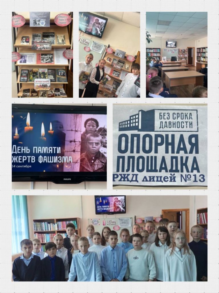 В преддверии Международного Дня памяти жертв фашизма в библиотеке РЖД лицея № 13 прошло мероприятие «Для памяти срока давности нет!». Обучающиеся 5 классов узнали об истории возникновения этого «Дня памяти», о преступлениях, совершенных фашистами в годы Великой Отечественной войны, о создании тысяч концлагерей, о событиях и гибели людей в деревне Хатынь, прослушали стихотворение Ильи Львовича Сельвинского «Я это видел». В завершении мероприятия все участники сошлись в едином мнении, что человечество заплатило слишком высокую цену за мирную жизнь. Так пусть же этот день служит вечным напоминанием всем народам, о том, что подобного ужаса более не должно совершиться!