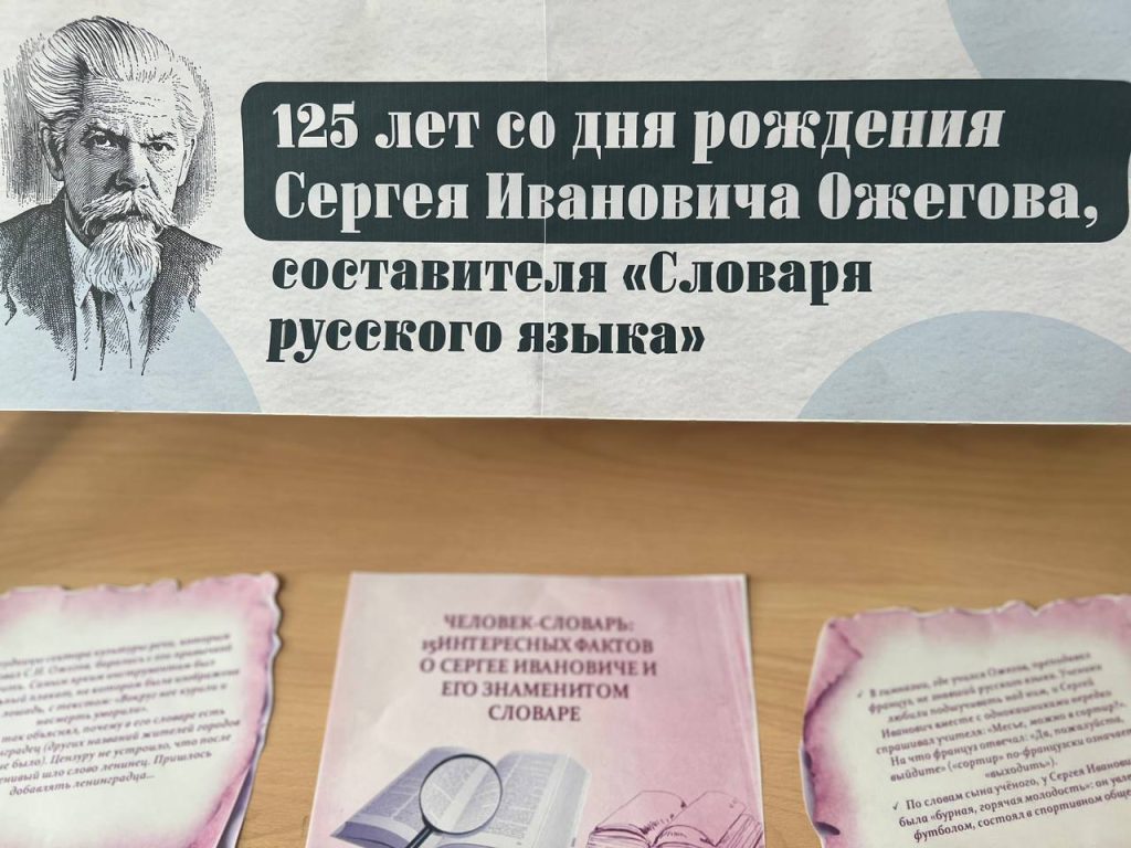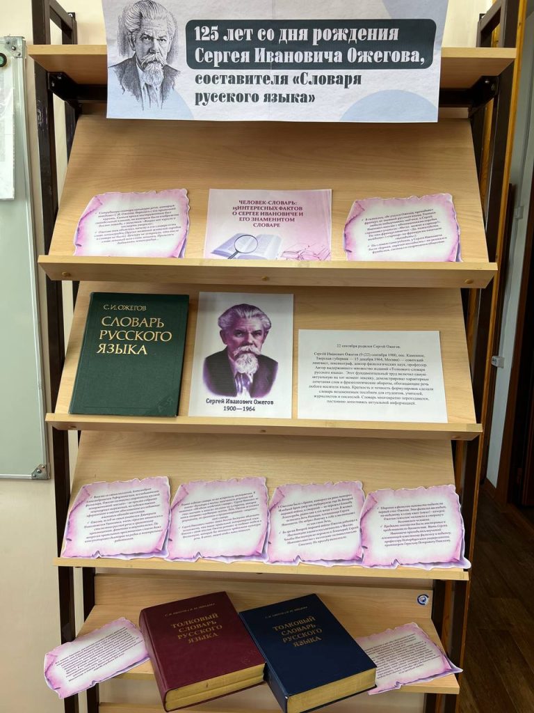 22 сентября к 125 — летию Сергея Ивановича Ожегова в читальном зале библиотеки РЖД лицея № 13 для обучающихся представлена книжно-иллюстративная выставка «Человек-словарь» 15 интересных фактов о Сергее Ивановиче и его знаменитом словаре. Сергей Иванович Ожегов-выдающийся ученый, лексиколог и лингвист, тонкий знаток не только языка своего народа, но и истории, культуры, этнографии. Главным его научным достижением стала разработка уникального однотомного «Словаря русского языка», опубликованного в 1949 году. В словаре можно найти значение и правильное написание 70 000 слов, ударение,примеры словоупотребления.