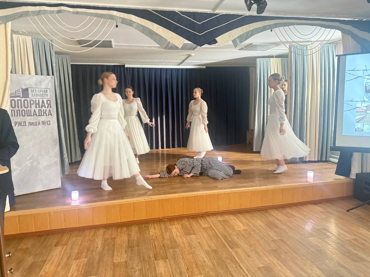 Проникновенное выступление директора РЖД лицея № 13 Нины Леонидовны Банных, пронзительная хореографическая композиция коллектива «Стиль», трогательная песня ансамбля «Домисолька», искренние и, прочувствованные до глубины души, выступления участников от начала до конца сохраняли атмосферу, передающую боль и надежду людей, прошедших все ужасы войны.