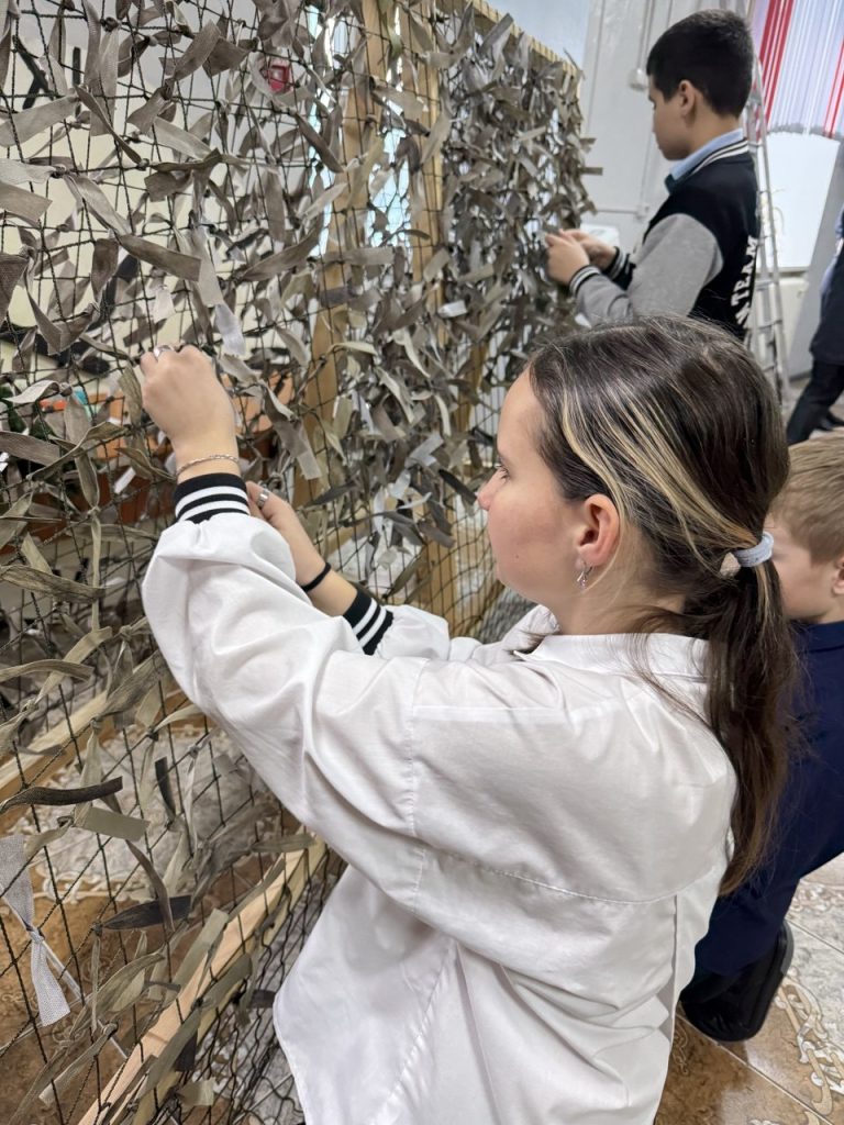«От мала до велика, от учителя до ученика – все объединились в одном порыве. На переменах, в любую свободную минуту, в школах плетут маскировочные сети. Это наш общий вклад, наше тепло и наша вера в победу, которые мы отправляем нашим ребятам на СВО.»